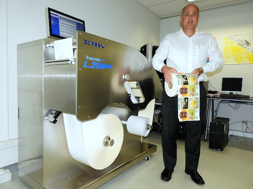 Screen Managing Director Peter Scott with the newly-arrived Truepress Jet L250AQ digital label press.