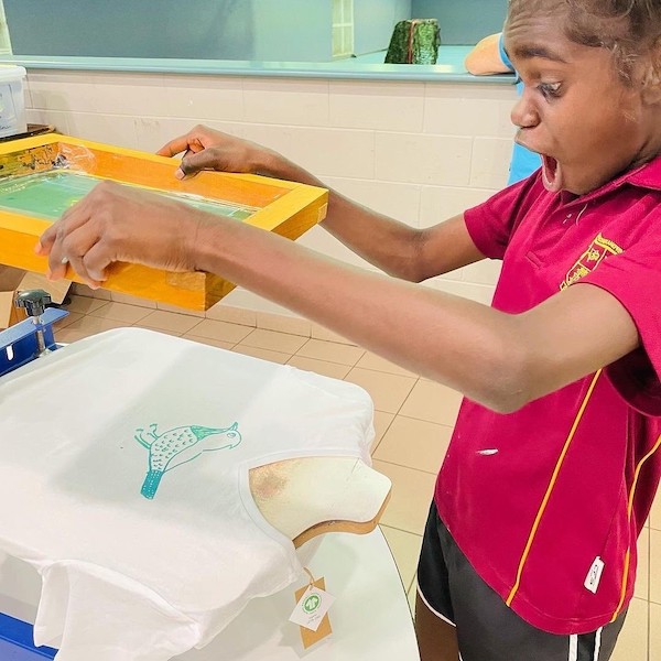 Colormaker provides free paints and inks to remote communities. Pictured is a student in Katherine WA screen printing with PERMASET Inks